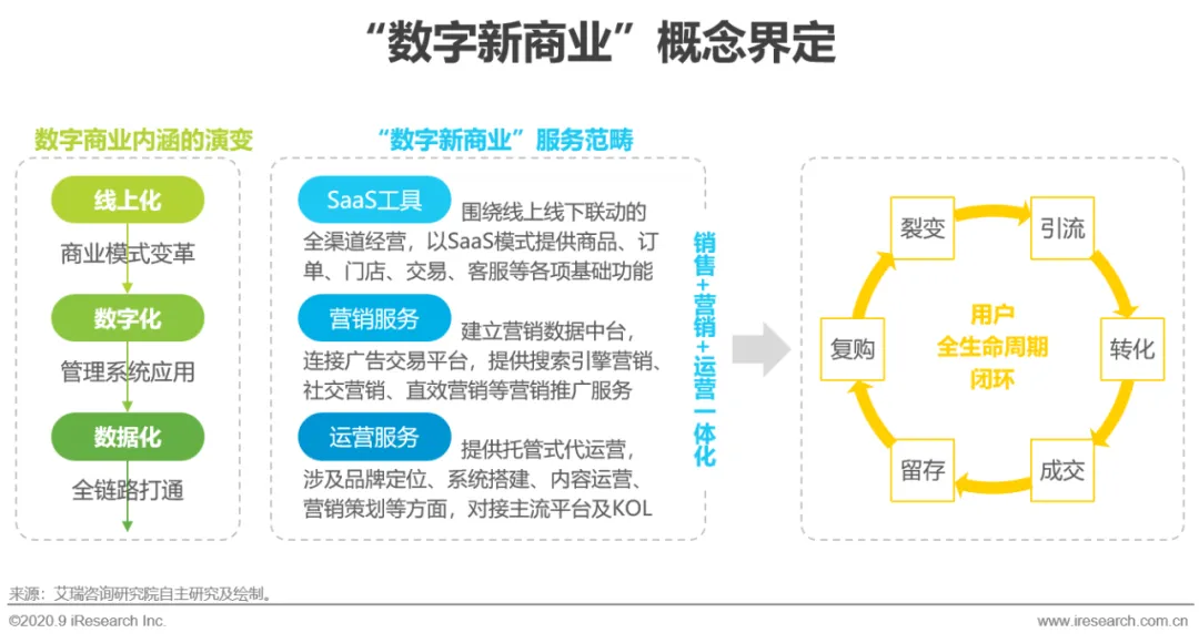 “数字新商业”服务商强调面向终端用户的销售、营销和运营一体化,以SaaS工具为牵引帮助企业实现基础的商品、订单、门店、交易、客服等功能,沉淀交易数据、用户画像提供综合的营销、运营服务,形成引流、转化、成交、留存、复购和裂变的用户全生命周期闭环。