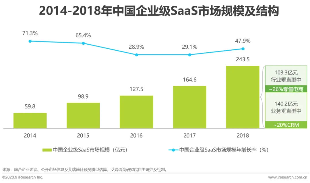 中国信通院云计算使用率调查显示,中国企业对云计算应用的接受程度逐年提高,2019年企业应用云计算的比例已经达到66.1%,其中公有云的使用率增长最快,较2017年上涨近7%。中国企业级SaaS服务中CRM和零售电商的市场规模分别领跑业务垂直型和行业垂直型SaaS,在与终端消费者息息相关的商业领域,SaaS模式正凭借降本增效、付费灵活、快速迭代等优势大展拳脚。