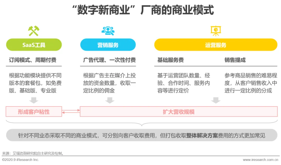 “数字新商业”厂商涉及的服务业态同时包括SaaS工具、营销和运营服务三大类,针对不同的服务业态遵循各自业态的收费模式,即SaaS工具采取订阅付费模式,营销服务采用代理费制,运营服务结合基础服务费与销售提成进行收费。