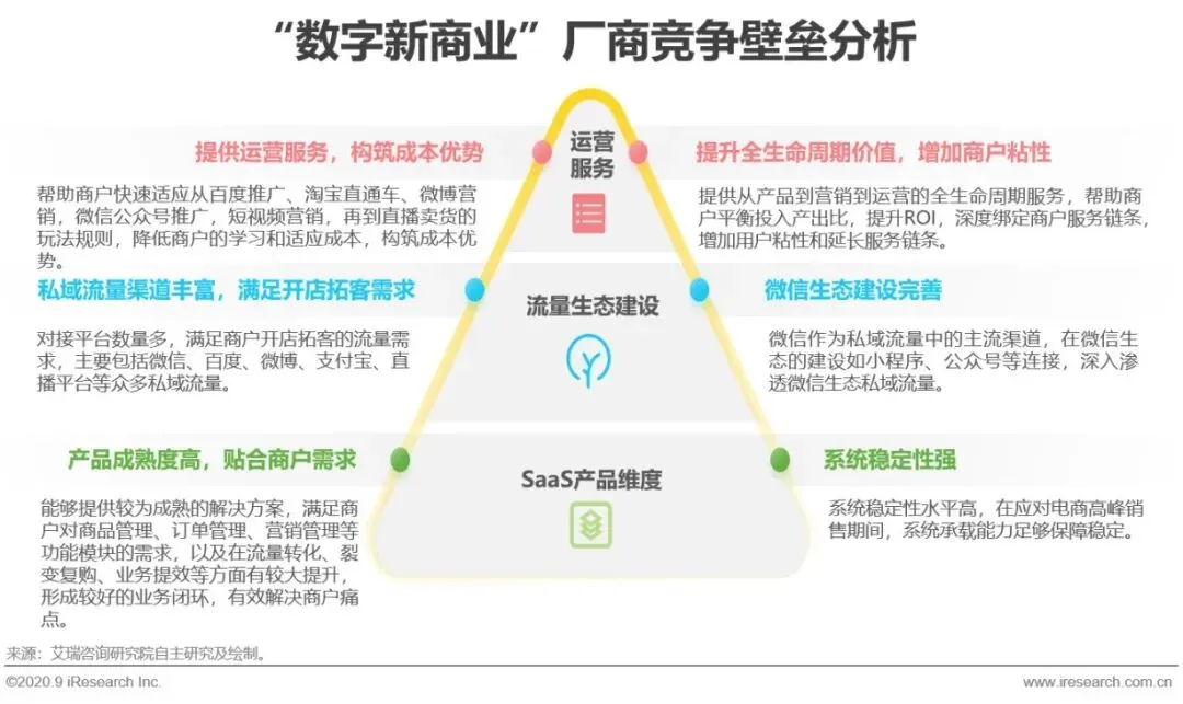 由于传统企业本身存在流量获取难、获客成本高、适应营销玩法时间长、缺乏运营经验等障碍。在产品和服务的选择上,能够满足商户需求、产品成熟且系统稳定,在私域流量生态建设上更加完善,并提供一定运营服务的厂商在数字新商业的竞争中更具优势。