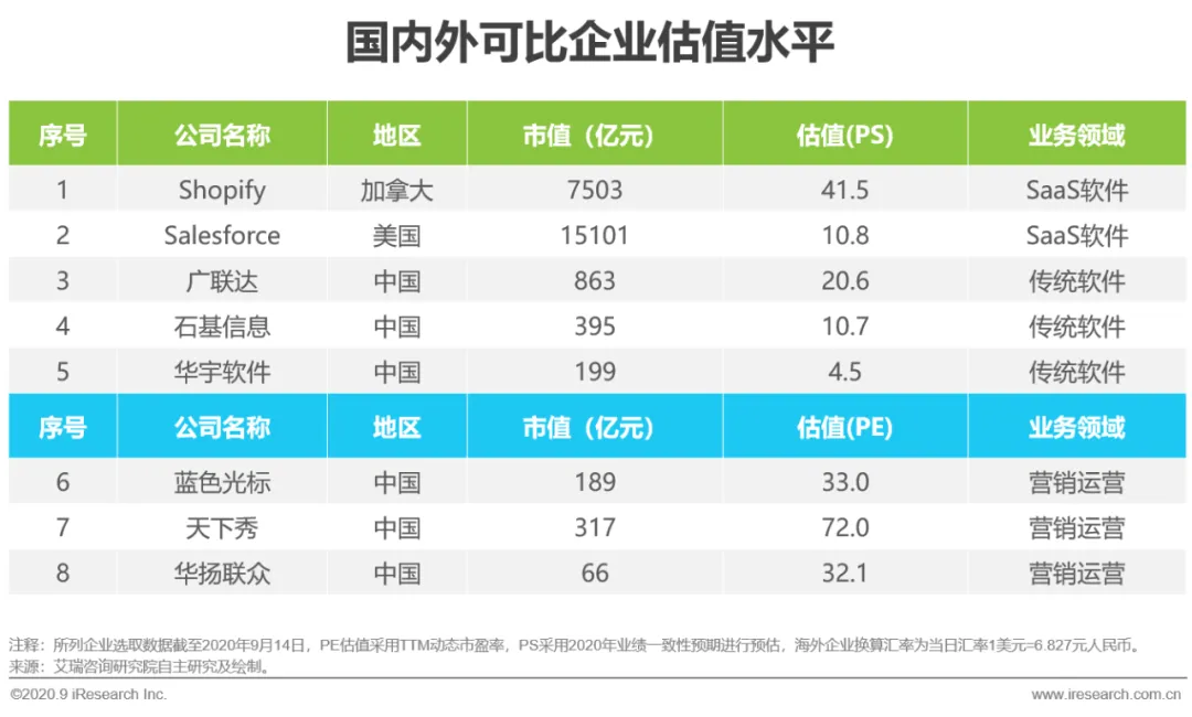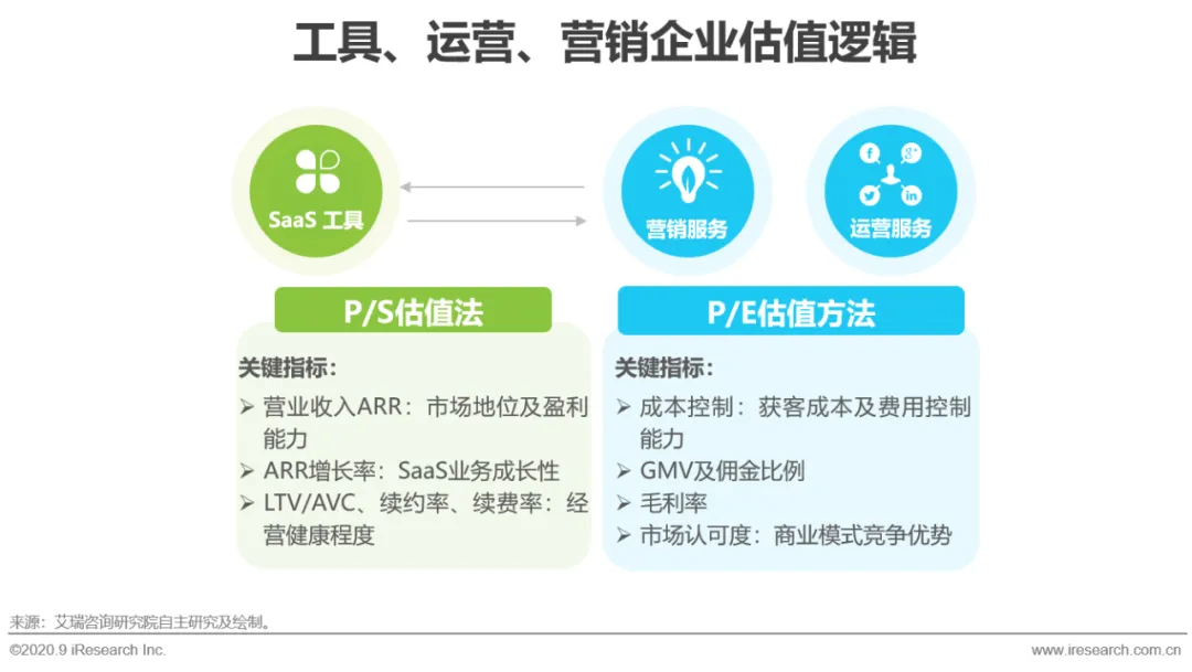 “数字新商业”转型背景下的厂商中,厂商的收入主要来自于SaaS工具收入和运营、营销等服务类收入,对于产品和服务两种业务通常采取不同的估值方式,产品类厂商和业务通常采取P/S估值方法,而服务类企业采取P/E估值方法。在关注数字新商业的厂商投资价值时,针对SaaS工具类更多的关注产品收入及增长、续费率和续约率等指标,而服务类厂商更多需要关注GMV和毛利率等盈利能力。对标国外厂商,SaaS工具类企业估值千亿以上,国内对标上市公司广联达等软件厂商企业市值也在800亿以上。营销运营类企业整体估值较低,但随着数字新商业拥抱产业的进程不断深入,佣金收入仍会为企业带来新的增长。而具备工具、运营、营销类业务的企业收入来源较多,业务协同性高,更具成长价值。