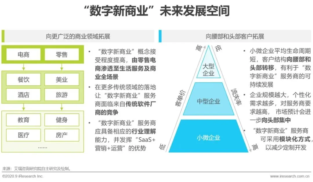 新零售转型、私域流量运营等理念率先在零售、电商领域盛行,并逐渐拓展至餐饮、美业、酒旅等生活服务业,2020年初新冠疫情的爆发进一步加速了“数字新商业”在全场景中的落地。随着“数字新商业”服务商深入到更广泛的垂直领域,将不可避免的遇到更多来自传统软件厂商的竞争,一方面对于特定领域的行业理解与服务经验将成为关键的竞争要素,另一方面“数字新商业”服务商应充分发挥SaaS模式及营销、运营综合服务的优势,与传统软件形成差异。在这一过程中,越来越多的中型、大型企业加入到“数字新商业”的阵营,客户规模的扩大意味着客单价提升、流失率降低,未来“数字新商业”的发展空间将更加广阔。