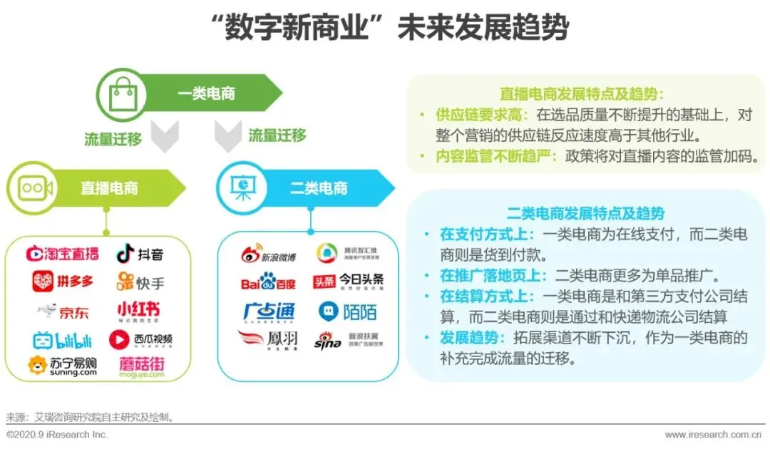 在“数字新商业”的转型进程中,一类电商起步早,且在互联网浪潮中释放出巨大流量红利,随着一类电商的流量红利见顶,以及商户在平台获客成本的增加,直播电商和二类电商作为一类电商的补充将逐年被商户和消费者所接受。目前,直播电商已经爆发出一定的活跃度,粉丝数量和带货转化不断增加,未来随着SaaS产品和直播平台的不断打通和合作,一类电商的部分流量会逐步迁移到直播电商,并带动整个商业模式的成熟。二类电商也会在渠道上进一步下沉,完成数字商业的底层渗透。“数字新商业”领域的头部厂商在获取一类电商流量的同时,已经开始向直播电商和二类电商布局,逐步完成流量的迁移和转化。