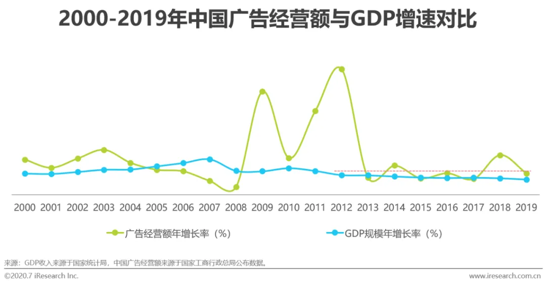 在2015年开始,中国经济增速放缓,进入长期下行周期,GDP同比增速自2015年“破七”以来持续下降。而2015年以来的广告经营额增速与GDP增速基本保持同步,2018年呈现小高峰后,2019年开始回落,但对比2013-2017年的增速水平,2019年处于中游水平。同时参考2003年非典过后的广告经营额增长情况,预测2019年后广告经营额增速短期内会出现下滑并进入一段迷茫期。但长期看,基于内部企业对营销结构的不断优化,外部环境经济复苏、5G技术广泛普及以及新型营销形式如直播营销、短视频营销形成长期的有效增长效应后,会推进广告市场进入一个增速向上的发展阶段。