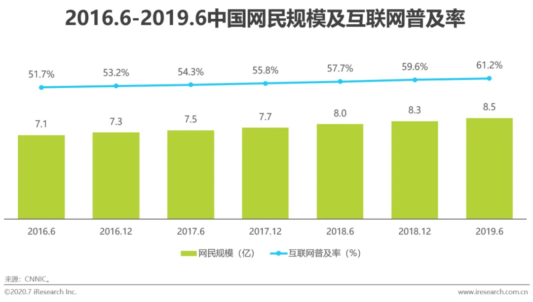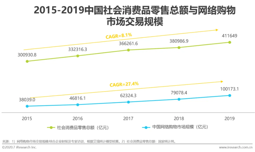 截至2019年上半年,我国互联网普及率已超过六成,用户互联网使用普及率不断增长,使用习惯也不断加固。同时,我国网络购物市场交易规模在过去五年中以27.4%的年复合增长率高速增长,远超社会消费品零售总额同期8.1%的增速。而此次新型冠状病毒疫情的发酵,线下消费场景受限,用户的线上网络消费习惯再一次被稳固和加强,未来随着消费者对线上消费渠道的深度倚靠以及消费者关键数据在电商平台的集中,电商平台的营销价值将再被放大。