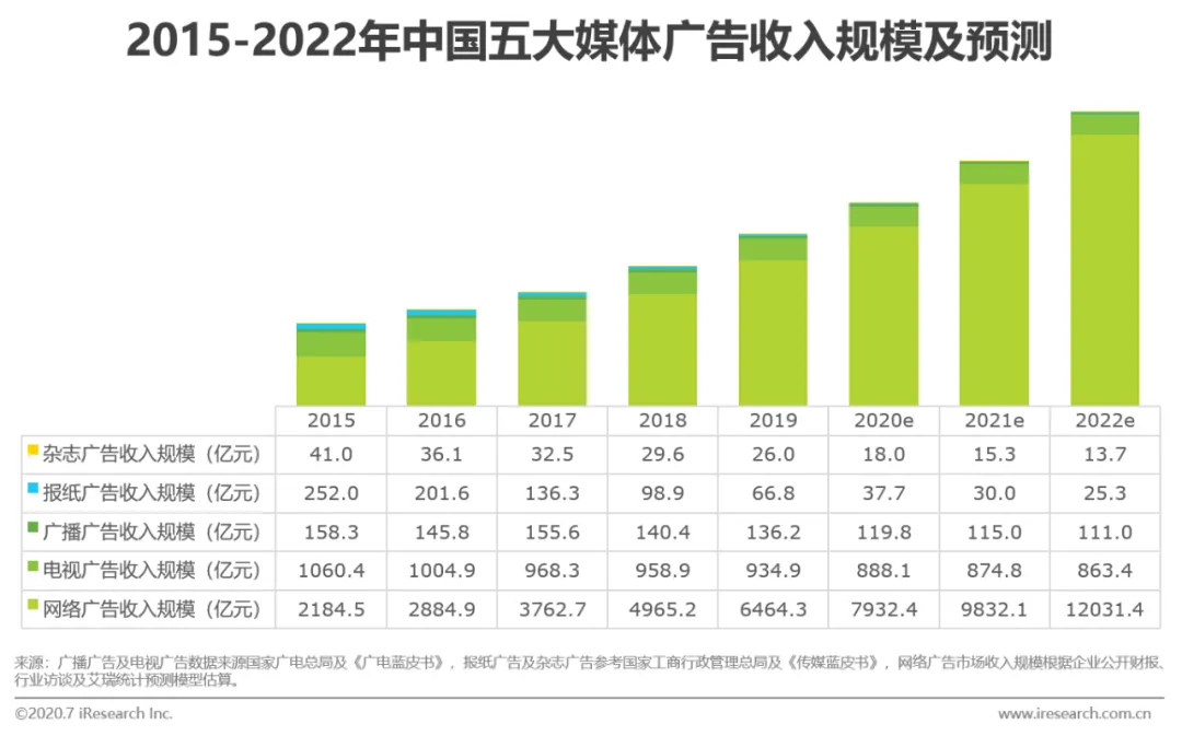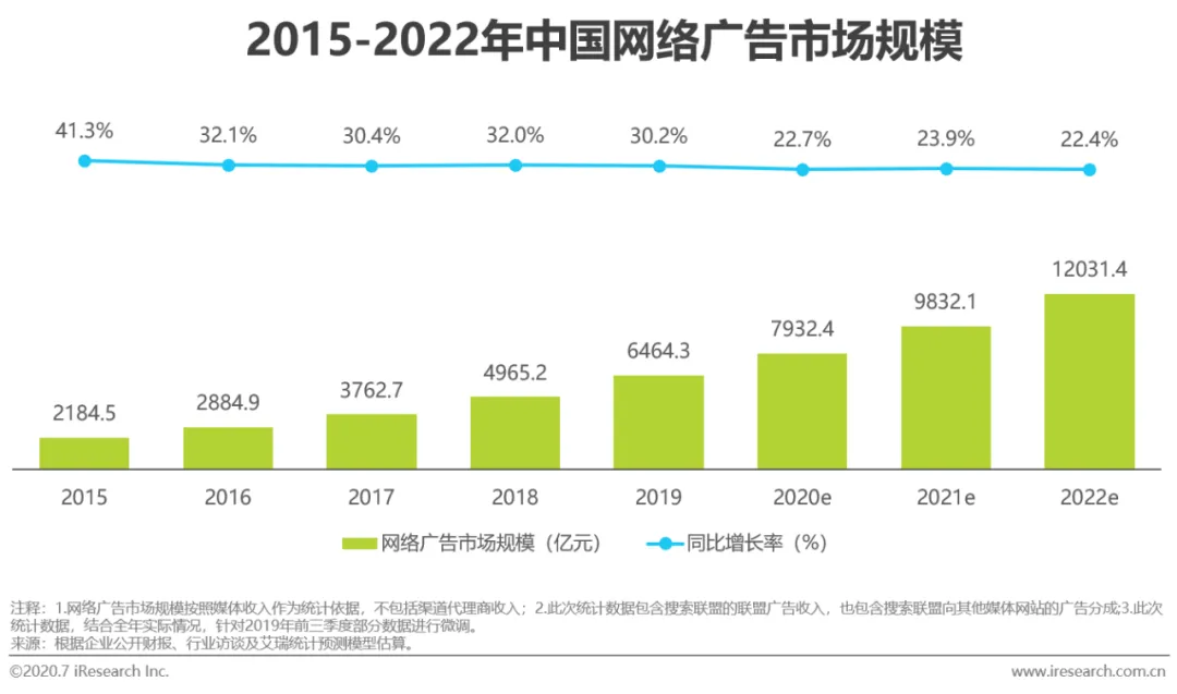 根据艾瑞咨询2019年度中国网络广告核心数据显示,中国网络广告市场规模达6464.3亿元,受整体经济环境下行影响,2019年中国网络广告市场规模同比增长30.2%,相比较2018年有所下降。未来几年,广告市场流量红利消退已是大势所趋,同时在2B产业互联网脉络逐渐清晰以及在营销工具化发展趋势的影响下,广告主的预算分配也会更多的向营销运营和内容营销分配转移,因此艾瑞预测未来几年网络广告的增速将继续呈现缓慢下降趋势。但从网络广告市场规模的绝对值来看,中国网络广告产业的生命力依然旺盛,预计在2022年市场规模突破万亿大关。