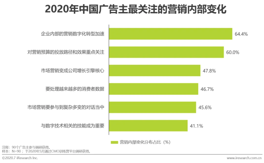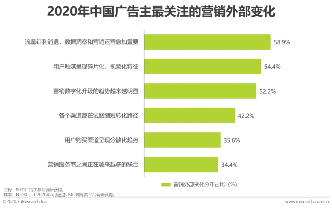 根据艾瑞广告主调研显示,超6成广告主认为内部营销发生的最大变化是“企业内部的营销数字化转型加速”和“对营销预算的投放路径和效果重点关注”;同时有接近6成的广告主认为外部营销最大的变化是“流量红利消退,数据洞察和营销运营愈加重要”。可以明显看到,在流量红利消退、数字升级迫在眉睫及疫情社会事件偶然发生多重因素叠加的背景下,大部分广告主在营销的数字化转型和营销运营精细化上达成了强烈的共识。