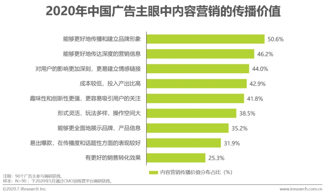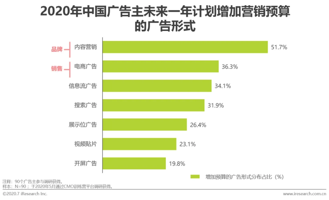 在广告主计划增加预算的广告形式中,超过5成广告主计划增加内容营销预算,其次是电商广告。同时,有50.6%的广告主认为内容营销的价值是能够更好的传播和建立品牌形象,有46.2%的广告主认为内容营销能够更好地传达深度的营销信息。在众多的形式中,内容营销能对提升品牌价值和建立良好的品牌形象有积极作用,可以让产品价值可触摸,而电商广告销售导向更强,两种形式完美匹配了广告主品效合一的诉求。