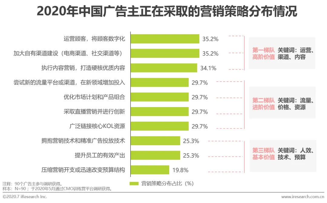 在有关广告主采取的营销策略调研情况中,处在第一梯队的营销策略是“消费者数字运营”、“加大自有渠道建设”和“内容营销”。而其余策略均围绕流量、价格、资源、人效等关键词展开,与传统策略中重点关注的营销要素相差不大。这意味着中国互联网企业的认知已经逐渐的脱离纯粹的流量、资源或价格竞争思维,而是进入到将营销运营和内容营销作为竞争壁垒的认知思维中。