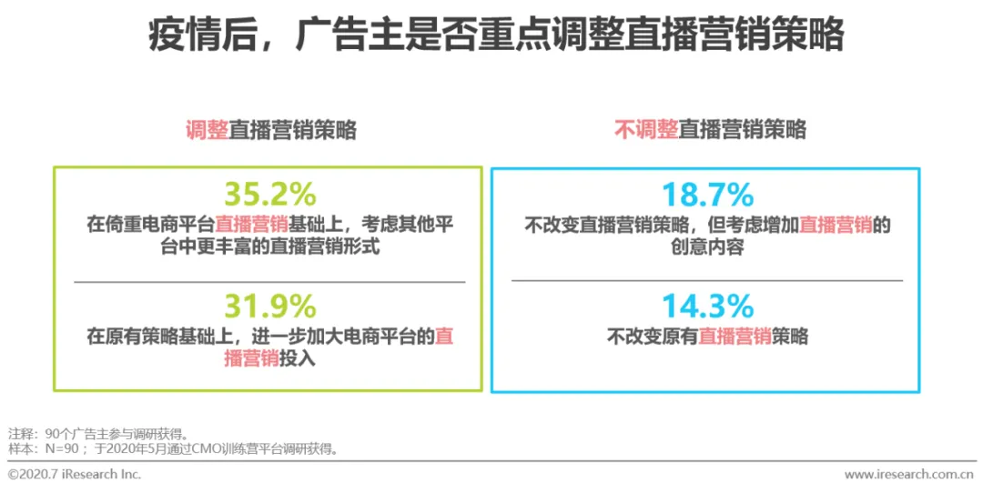 根据艾瑞广告主调研显示,53.9%的广告主认为疫情发生后,消费者活跃度明显增加的平台是直播平台,其次是短视频平台。疫情的发生使线下营销场景受限,直接带来了直播营销的红利,成为广告主重点采取的营销手段。而在广告主疫情发生后是否重点采取直播营销策略的调研上,考虑调整的占比在60%以上,其中有35.2%的广告主表示在倚重直播营销的基础上,考虑其他平台中更丰富的直播营销形式,还有31.9%的广告主表示在原有策略基础上,进一步加大电商平台的直播营销投入,这说明无论是电商平台中的直播营销还是非电商平台中的直播营销,都引起了广告主的关注和尝试。