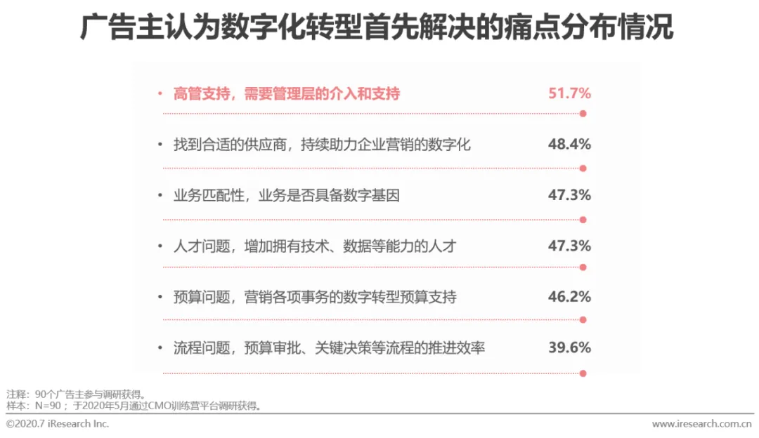 疫情发生后,大部分广告主认为营销数字化升级有必要,仅有3.3%的广告主认为数字升级需要视情况而定。同时有超5成广告主认为在企业内部顺利进行数字化转型需要管理层的深度介入和支持。数字化转型是侧重技术的概念输出,在企业的贯彻和执行中,需要业务流程和营销工作流的标准化和技术化,更涉及到整个企业自上到下的业务流程和组织机构的变革,因此高管的深度介入是营销数字化能否顺利进行的关键。