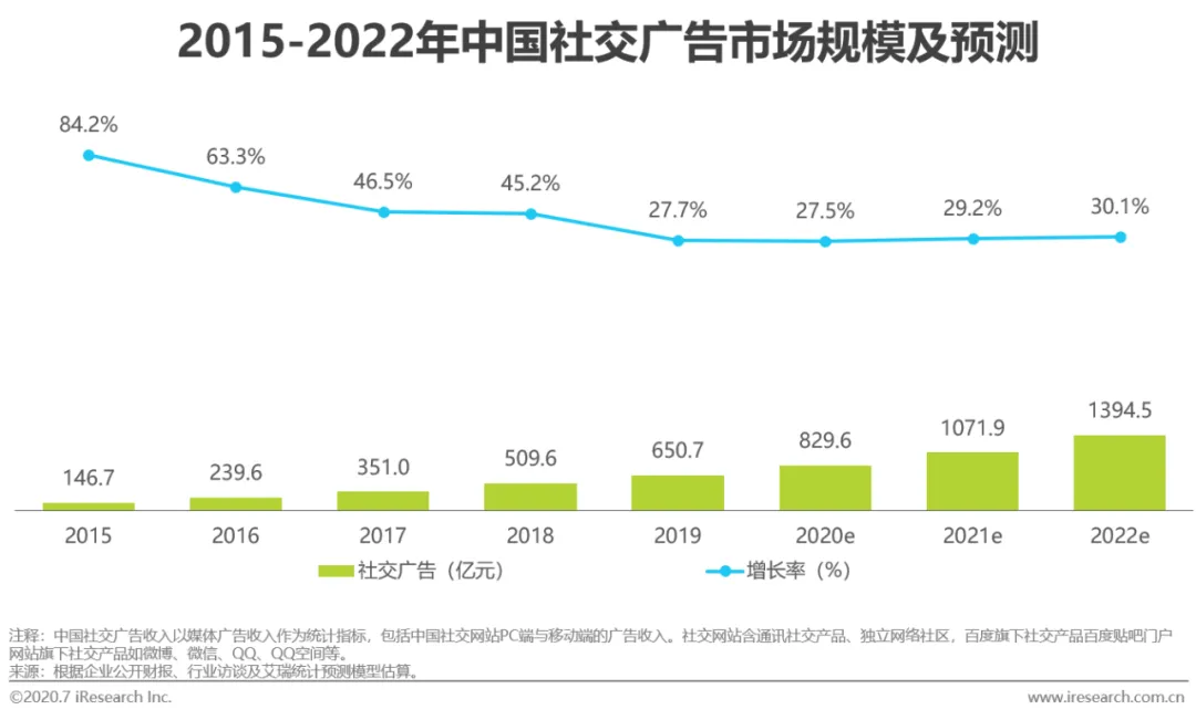 2019年中国社交广告市场规模为509.6亿元,预计到2022年将超接近1400亿元。艾瑞分析认为,社交广告驱动因素由流量向技术转移,在社交网络市场规模中占比逐年增长,反映出各社交网络平台对于社会化营销的探索和创新为广告主提供了优质的营销土壤。艾瑞预计,受疫情影响,广告主预算短期内大幅缩减,未来两到三年,社交广告市场整体增速较前几年将显著降低,而伴随经济复苏,恢复稳定增长。