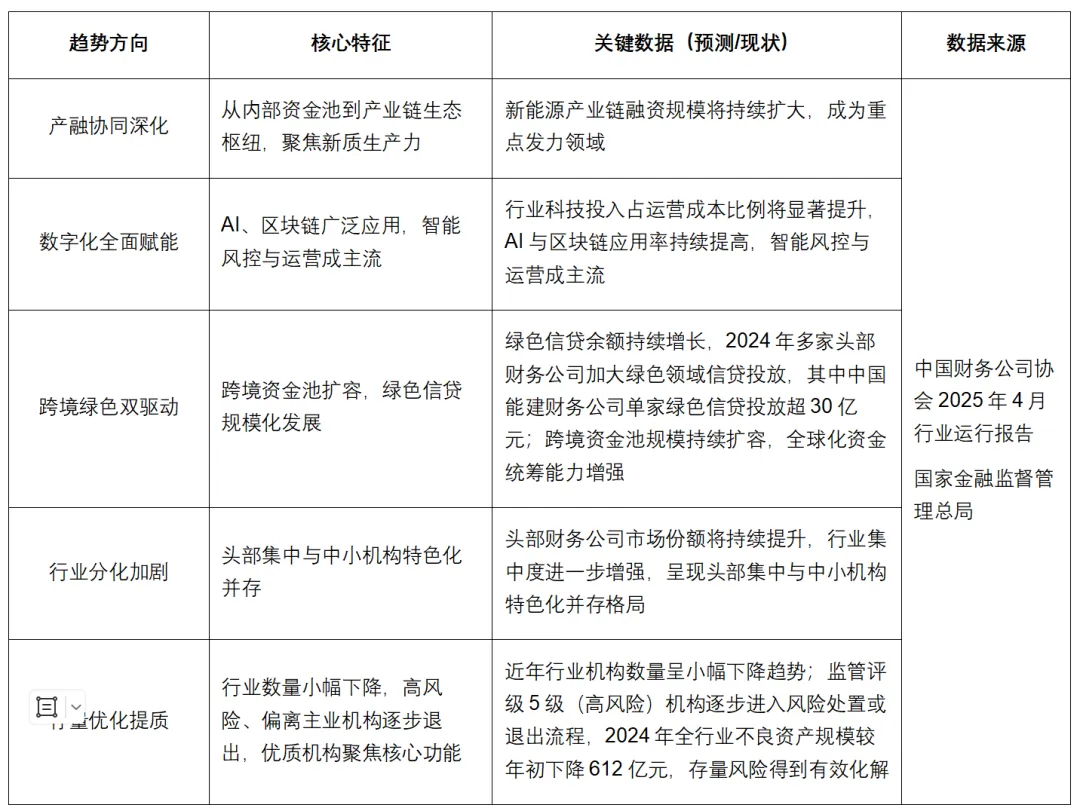 结合监管导向与市场需求,未来财务公司将围绕“产融深化、数字赋能、跨境绿色双驱动、合规盈利并重、存量优化提质”五大主线演进,其中“存量优化提质”明确了行业数量变化趋势—整体呈小幅下降态势,优质机构愈发集中,具体趋势如下: