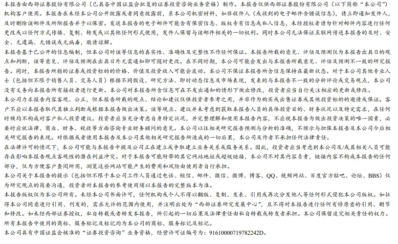 在任何情况下,本公众号所载的观点、结论和建议仅供投资者参考之用,并非作为购买或出售证券或其他投资标的的邀请或保证。客户不应以本公众号取代其独立判断或根据本报告做出决策。该等观点、建议并未考虑到获取本报告人员的具体投资目的、财务状况以及特定需求,在任何时候均不构成对客户私人投资建议。投资者应当充分考虑自身特定状况,并完整理解和使用本公众号内容,不应视本公众号为做出投资决策的唯一因素,必要时应就法律、商业、财务、税收等方面咨询专业财务顾问的意见。西部证券以往相关研究报告预测与分析的准确,不预示与担保本公众号及西部证券今后相关研究报告的表现。对依据或者使用本公众号及西部证券其他相关研究报告所造成的一切后果,西部证券及作者不承担任何法律责任。
