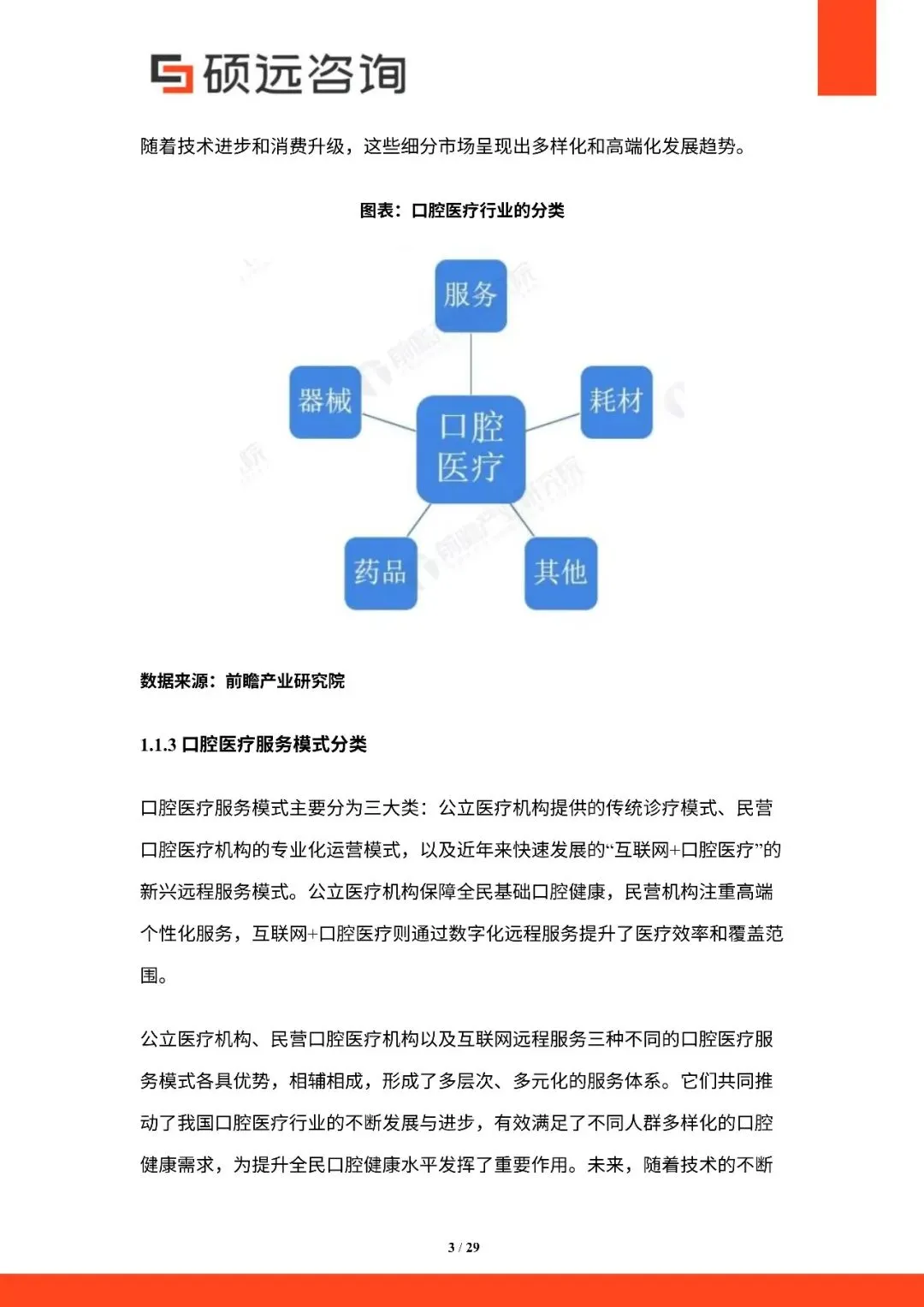 口腔医疗服务模式主要分为三大类:公立医疗机构提供的传统计珍疗模式、民营口腔医疗机构的专业化运营模式,以及近年来快速发展的"互联网+口腔医疗"的新兴远程服务模式。公立医疗机构保障全民基础口腔健康,民营机构注重高端个性化服务,互联网+口腔医疗则通过数字化远程服务提升了医疗效率和覆盖范围。