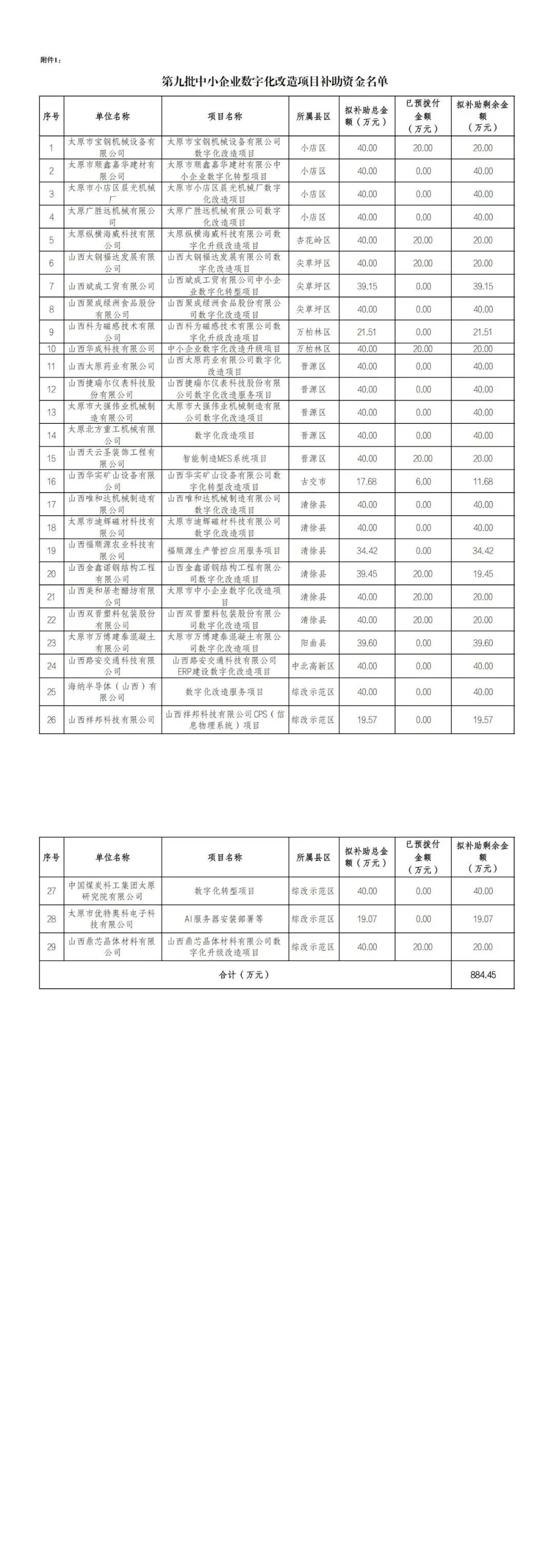 根据《中小企业数字化转型专项资金使用管理暂行办法》、《关于组织开展太原市中小企业数字化转型试点企业数字化改造补助资金申报工作的通知》有关要求,市工信局组织开展了试点企业数字化改造补助资金申报工作,经第三方机构评测验收、县区推荐、专家评审、会议研究等程序,现将第九批中小企业数字化改造项目补助资金名单予以公示(详见附件),如有异议,请在公示期内以书面形式反馈我局,并提供必要的佐证材料。