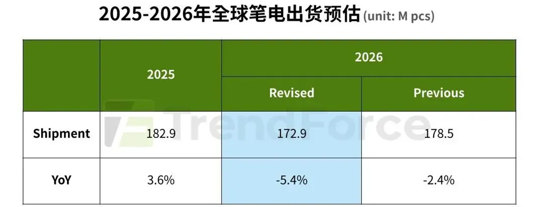 因此,TrendForce再度下调2026年全球笔电出货预估至年减5.4%,降至近1.73亿台,以反映品牌面对成本压力扩大,对库存、促销与产品配置采取的保守态度。