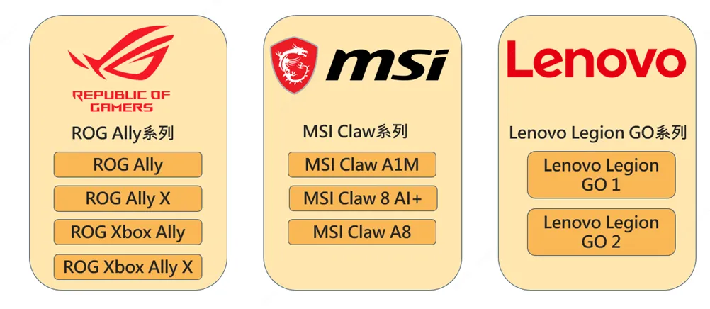 - 目前市面上Windows掌机主要业者及产品有华硕的ROG Ally系列、微星的MSI Claw系列及联想的Lenovo Legion GO系列等。
