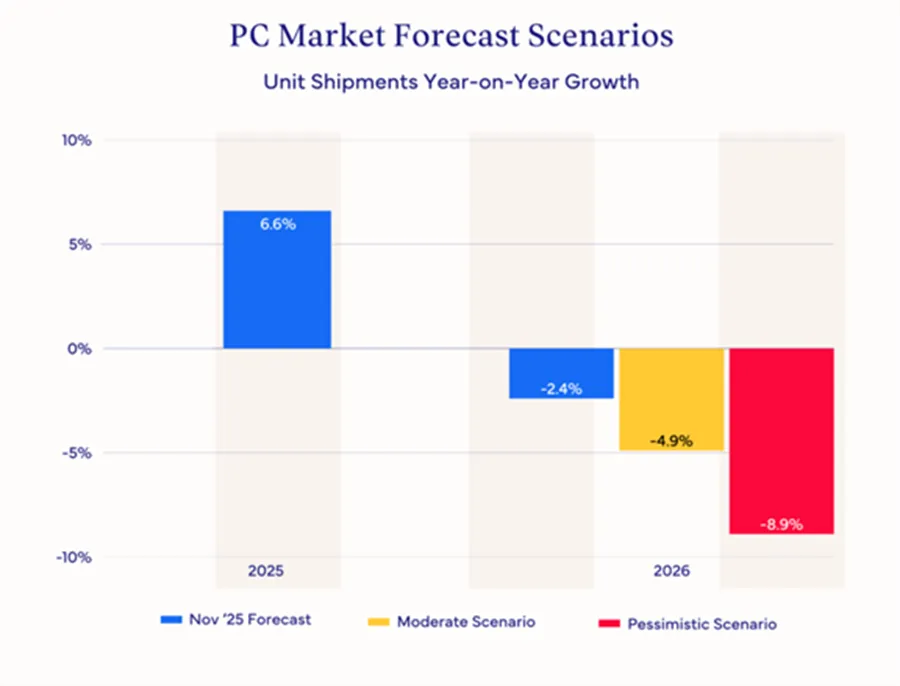倘若2026年第二季存储器价格涨幅未合理收敛,而品牌在无法顺利转嫁成本下,恐将面临低端、消费型笔电需求进一步走弱,不排除2026年全年出货将朝悲观情境发展,下探至年减10.1%。