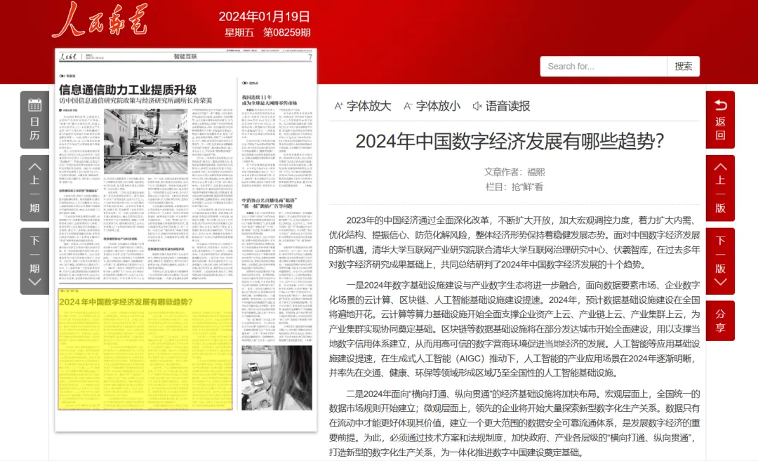 2023年的中国经济通过全面深化改革,不断扩大开放,加大宏观调控力度,着力扩大内需、优化结构、提振信心、防范化解风险,整体经济形势保持着稳健发展态势。面对中国数字经济发展的新机遇,清华大学互联网产业研究院联合清华大学互联网治理研究中心、伏羲智库,在过去多年对数字经济研究成果基础上,共同总结研判了2024年中国数字经济发展的十个趋势。