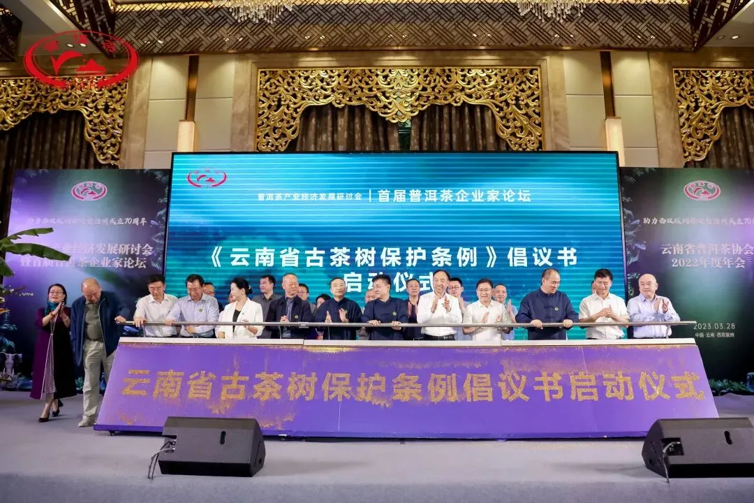 此次论坛中,参会的茶业企业及协会代表共同发布《云南省古树茶保护条例》倡议书,并举行了隆重的启动仪式,号召全省涉茶企业与个人,全国广大茶友群众,积极宣传保护云南宝贵的古茶树资源。2022年11月,《云南省古树茶保护条例》经云南省人大常委会审议通过,并于2023年3月1日正式实施。这个条例对云南省古树茶资源的合理保护及开发利用进行了法律保障及规范,可以说是云茶产业发展上里程碑的事件。云南省普洱茶协会监事长杨云鹏宣读倡议书