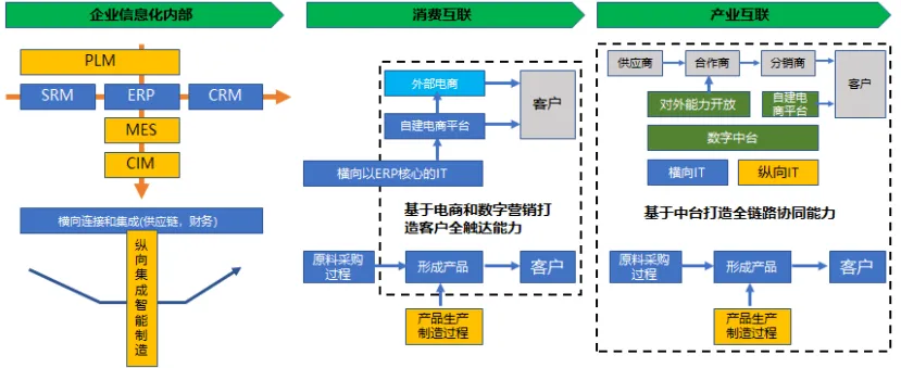 在前面已经谈到企业数字化转型中仍然需要完成企业内部信息化建设和集成问题。这个集成包括了横向以业务价值链为核心的协同和集成,也包括了垂直的以生产制造为核心的集成。同时还得实现横向和纵向之间的集成。