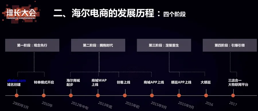 在海尔分享自己的数字化转型经验的时候,谈到了海尔电商发展的四个阶段,即从最早的电商平台建设到后期的生态整合,如下: