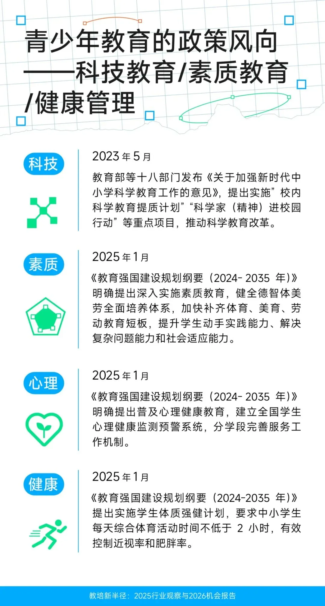 政策端的信号是:不再以“压缩规模”为核心,而是推动行业“合规、提质”发展。确定性增强,本身就是行业的利好。不论是2024–2025 年的政策文件(如《教育强国建设规划纲要(2024—2035)》、校外培训管理条例的推进等),还是十五五规划,都呈现出一个清晰趋势: