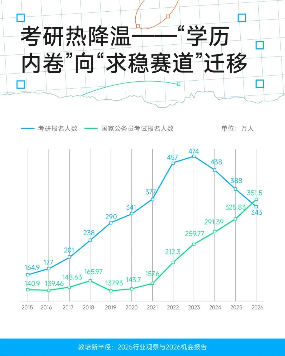 考研报名人数继续从2024年的438万降到388万,2026届(2025年底报名)进一步下滑至343万人左右。这是自2015年以来考研报名人数出现的3年连续下滑。另一边,“公考热”再创新高,2025年国考(国家公务员考试)报名人数突破340万,2026年超过351万。“求稳”心态依然占据主流,公考培训(及事业编、教师编培训)成为成人职业教育中最坚挺的刚需赛道。