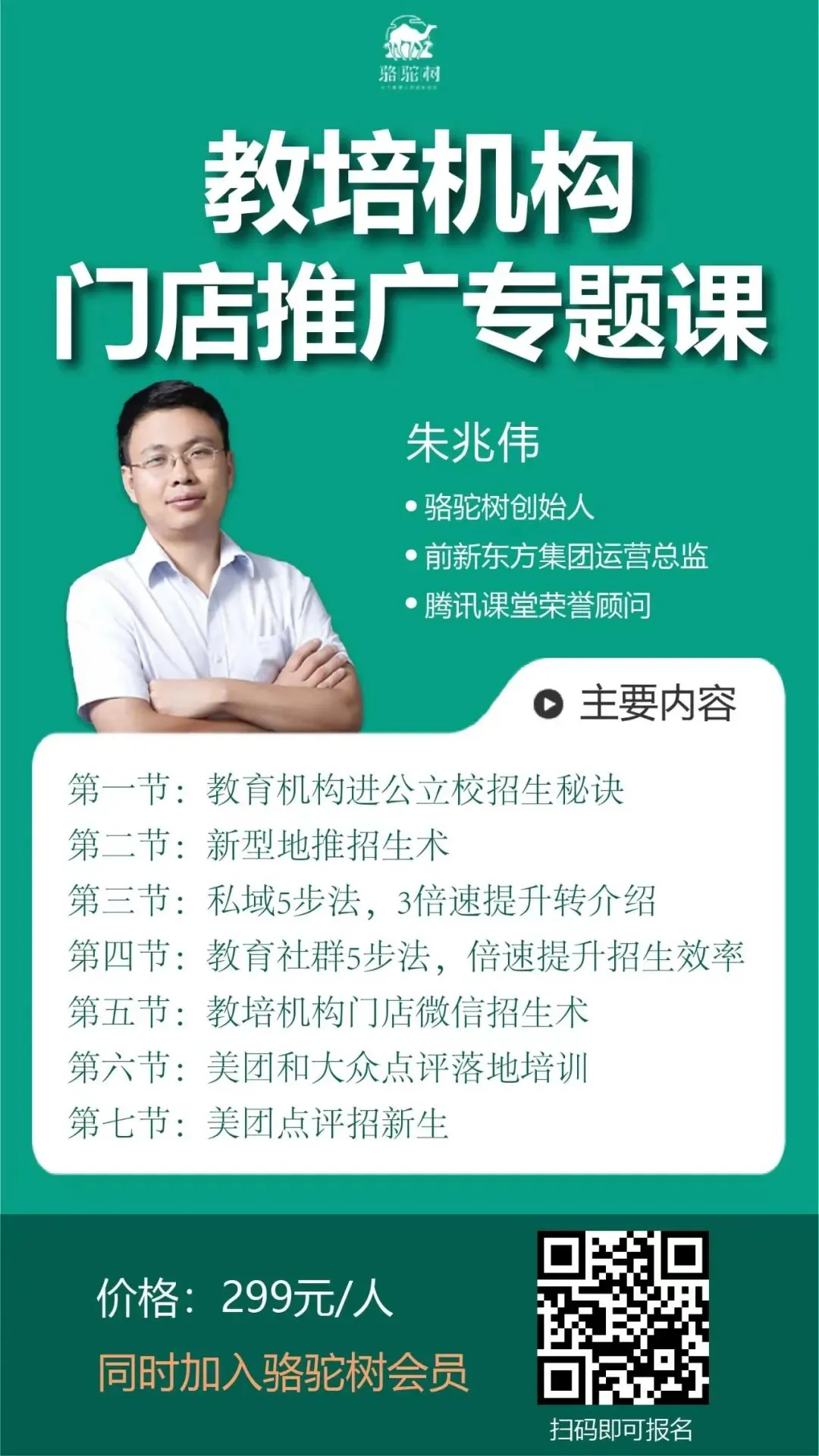 线上获取流量 往期精彩回顾 1、教培行业强劲复苏,我们一起深度链接 2、教师工作室,一年如何从200万到1000万? 3、教培机构招生的12种渠道(上) 4、教培机构招生的12种渠道(下) 5、教育行业的12种推广方式(一):新型地推 6、社群,教培机构招生和口碑传播的利器(上) 7、社群,教培机构招生和口碑传播的利器(下) 8、教培机构市场推广八大招(三):美团和大众点评招新生 9、教育机构如何线上引流?小红书账号起号全流程 10、教培机构都要会的做推广三板斧 11、关于运营的一些思考