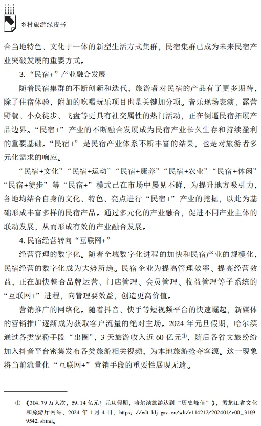 《中国乡村旅游发展报告(2024)》全面落实党的二十大部署,将乡村旅游高质量发展的实践与推进中国式现代化紧密相连,紧扣共同富裕远景与宜居宜业和美乡村建设需求,对新时代我国乡村旅游的成果与走势进行了系统梳理。报告强调,乡村旅游既是现代旅游体系的重要组成部分,也是保护传承乡土文化、促进城乡融合的重要载体,发展过程中要尊重农民主体性,激发产业内生动力。同时倡导在保护与传承乡村文化的基础上引入现代运营理念与数字科技,让更多人通过数字手段感受乡村文化魅力。