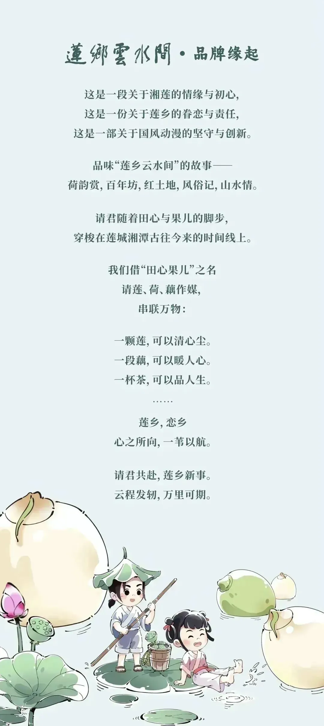 推进马栏山音视频新基建项目,支持马栏山音视频实验室等创新平台高水平发展。培育引进一批文化“链主”企业,壮大初创力量。积极培育微短剧、数字文博、数字演艺等新型文化业态。持续优化“智慧文旅”服务平台,推出系列“非遗+文创”数字产品,用现代科技讲述古老故事,让“文化+科技”的双翼引领不一样的诗和远方。 《莲乡云水间》项目简介
