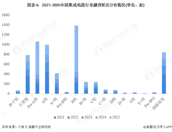 近五年来,我国集成电路行业融资轮次最多为B轮,且天使轮、PreA轮、A轮等早期轮次的融资数量显著高于C轮及以后的中后期轮次,是行业融资的主力,初创项目的获投活跃度较高。除此之外,战略投资的事件数也较多,体现了企业在构建长期产业生态时,融资积极性较高。