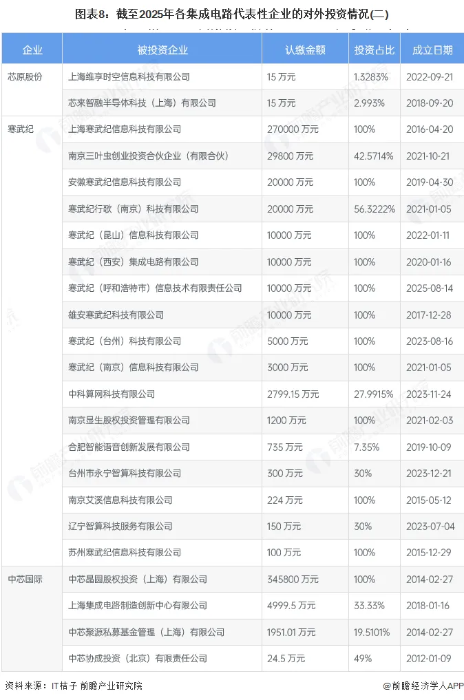 下面汇总了四家集成电路代表性企业截至2025年的对外投资情况,整体目的是为了通过产业布局与生态协同,突破自身存在的技术瓶颈,推进国产替代,强化企业的核心竞争力。