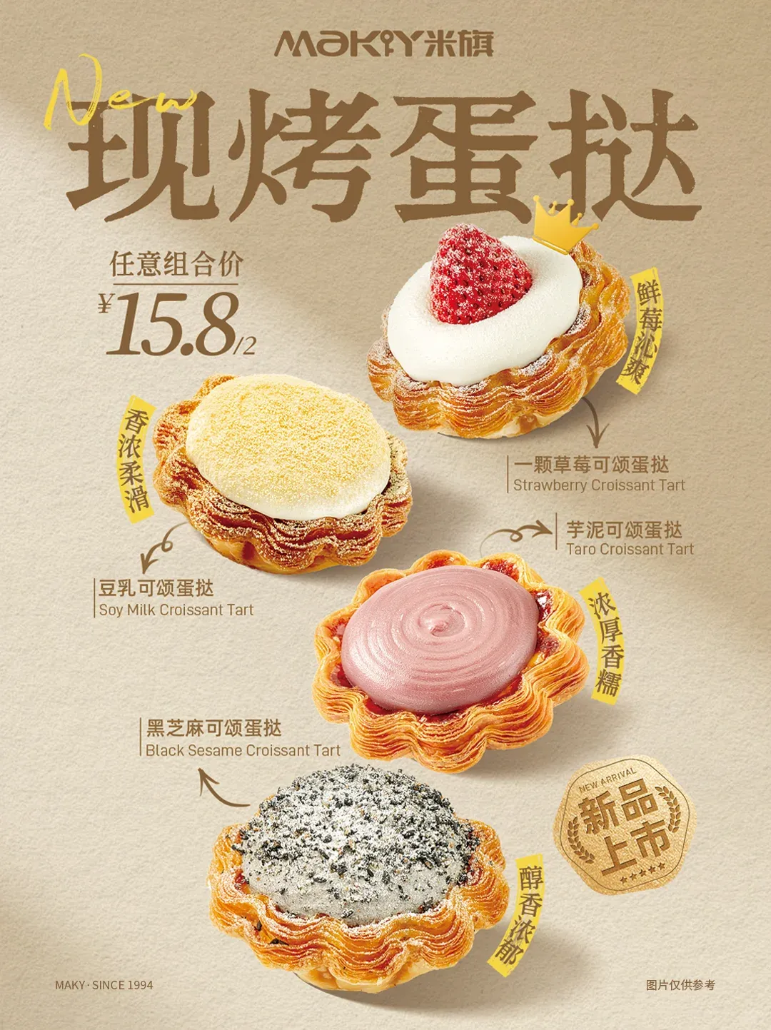 酥到掉渣的可颂挞皮+4种神仙内馅,每一口都是双重快乐!「一颗草莓可颂蛋挞」鲜莓沁爽,一口解腻,「豆乳可颂蛋挞」香浓柔滑,自带清甜豆香,「芋泥可颂蛋挞」浓厚香糯,绵密芋泥直接拉丝,「黑芝麻可颂蛋挞」醇香浓郁,越嚼越香。