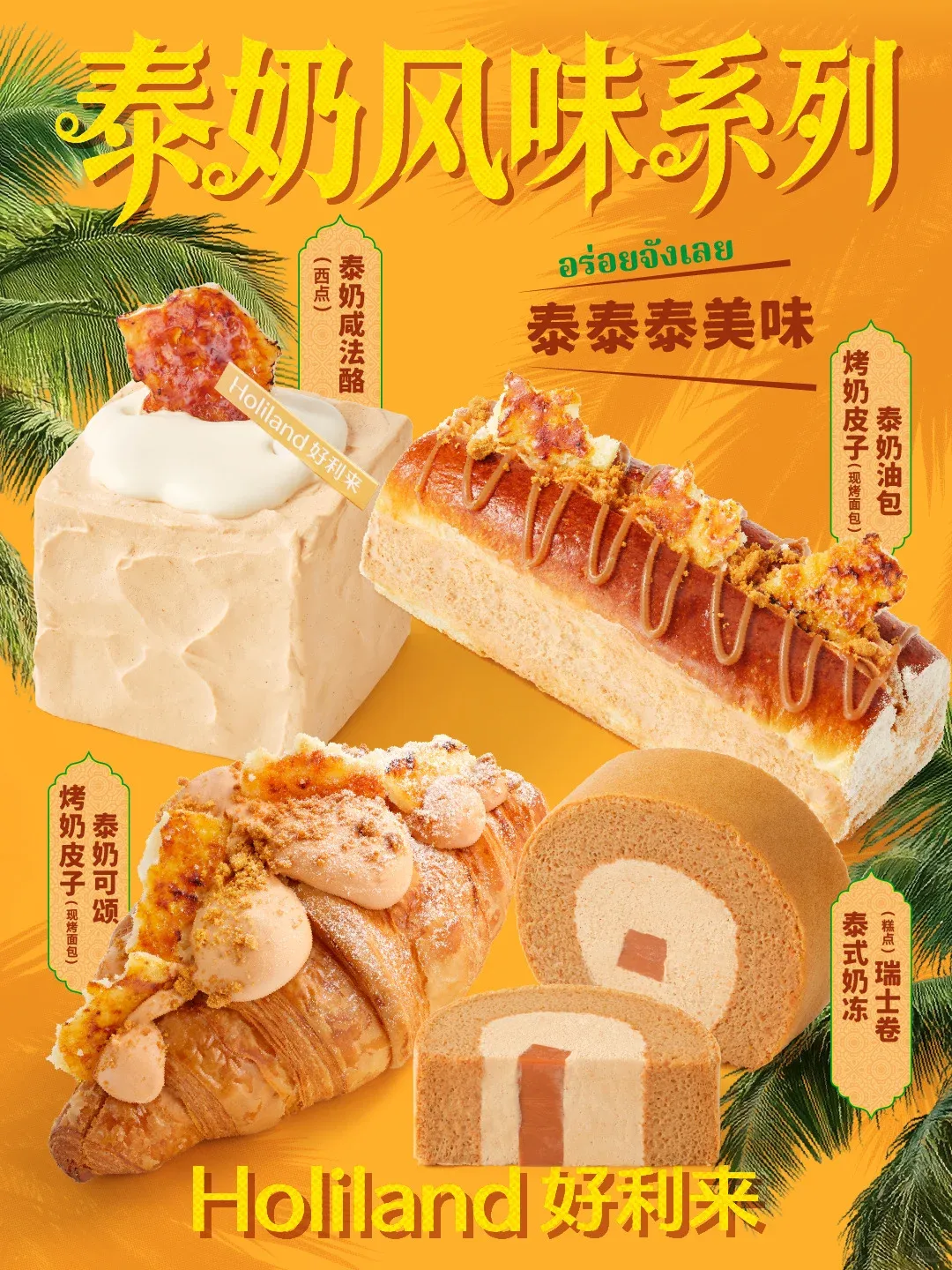 泰泰泰美味啦!「泰奶咸法酪」经典泰奶融入微咸法酪,茶韵芝香交织,层层浓郁香醇。「泰式奶冻瑞士卷」泰式红茶浸润海绵蛋糕坯,包裹Q弹泰式奶冻,三重柔润在舌尖温柔漫溢。「烤奶皮子泰奶油包」外层松软面包,内里饱满奶油,口感“泰”惊艳!「烤奶皮子泰奶可颂」16层开酥工艺,现烤黄金酥皮,绵密奶油交织焦糖色泽,诠释浓郁而细腻的泰式风味。