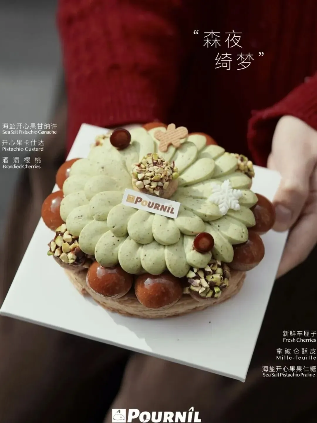 海盐开心果甘纳许奶油带来第一重咸甜交融的绵密;中间的开心果卡仕达与底部的海盐开心果果仁糖,则叠出深邃浓郁的坚果香气。