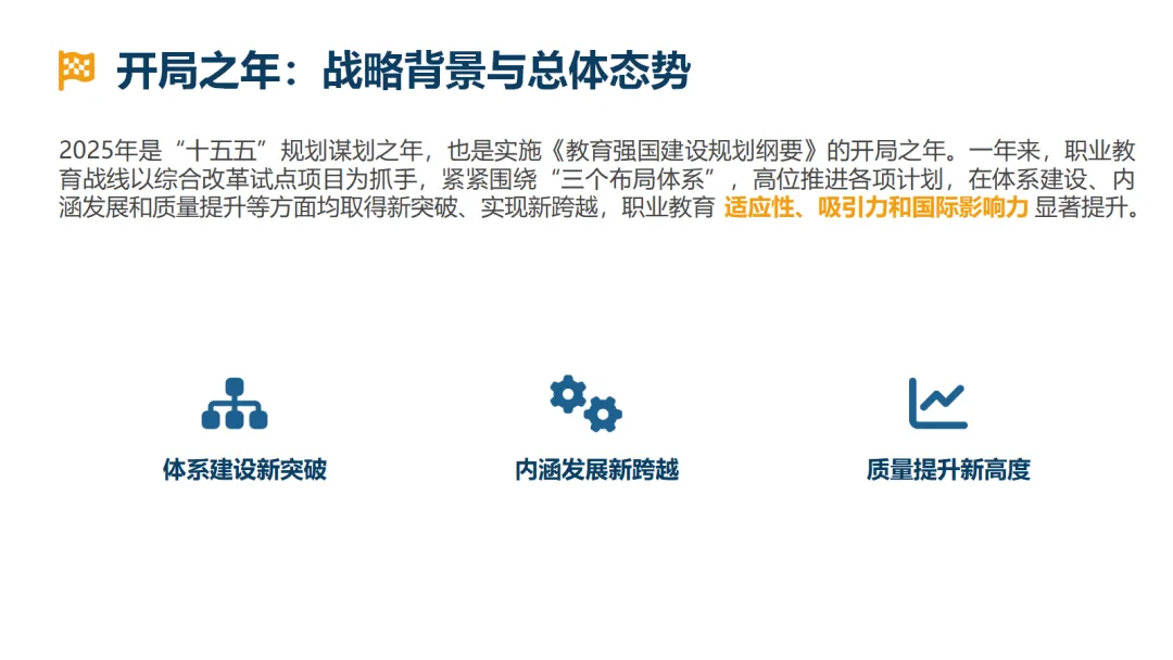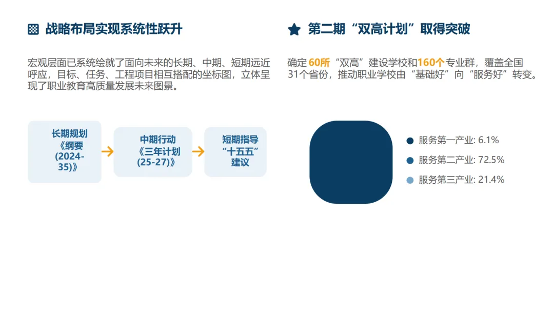 战略布局系统化:《教育强国建设规划纲要》及配套行动计划,为职业教育绘制了长、中、短期相结合的立体化发展坐标图。
