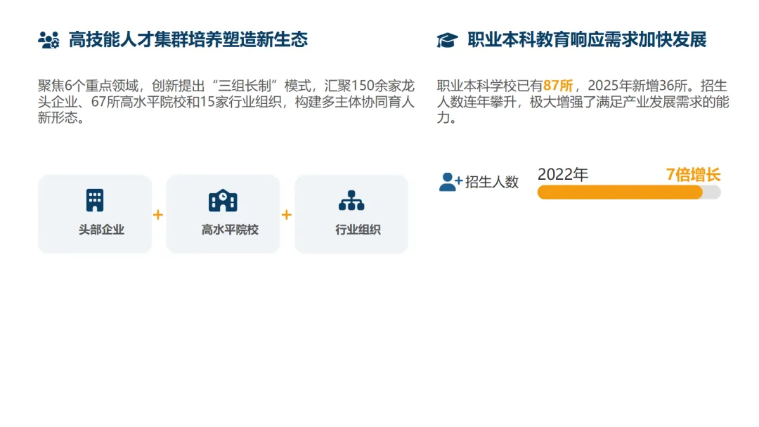 职业本科快速发展:职业本科学校数量与招生规模大幅增长,2025年招生人数为2022年的7倍,有效响应了产业升级对高层次技术技能人才的迫切需求。