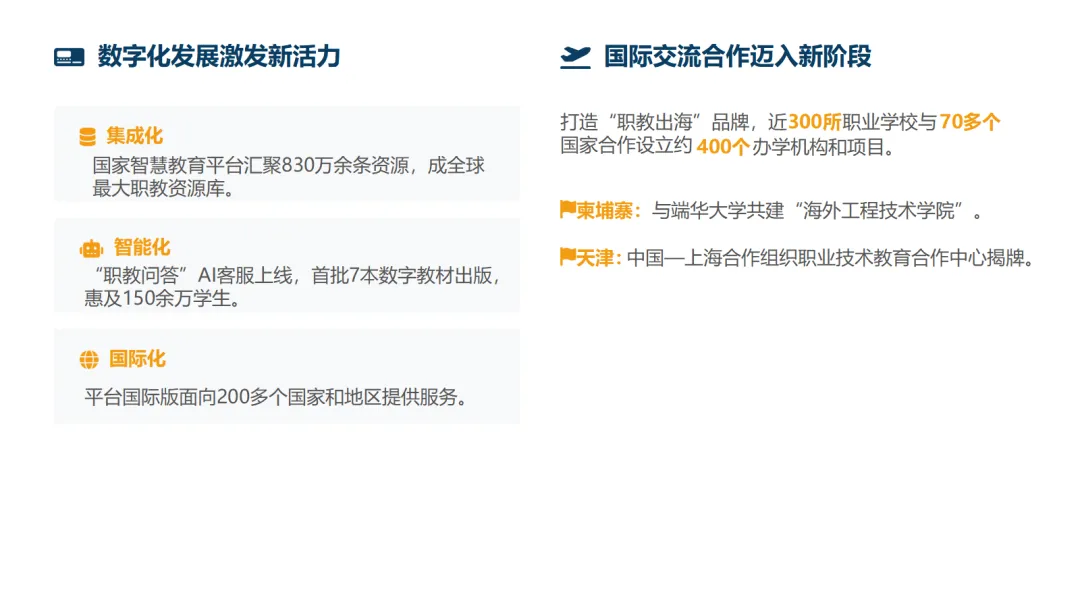 数字化转型深化:国家职业教育智慧教育平台建成全球最大的职教数字资源库,并推出AI客服、数字教材等智能化应用,同时上线国际版平台,推动资源全球共享。