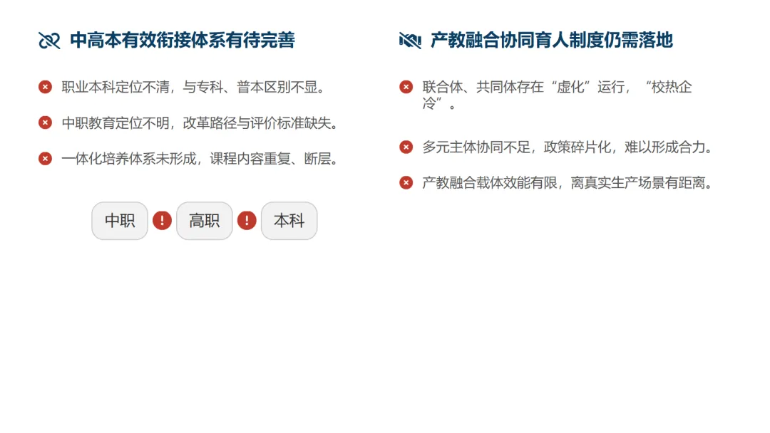 报告也清醒地指出了当前面临的三大核心挑战:中高本衔接的职教体系有待完善、产教融合协同育人需真正落地、高中阶段职普融通路径亟待规范。