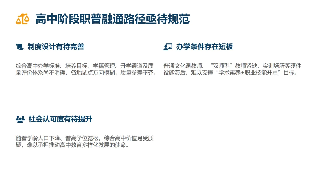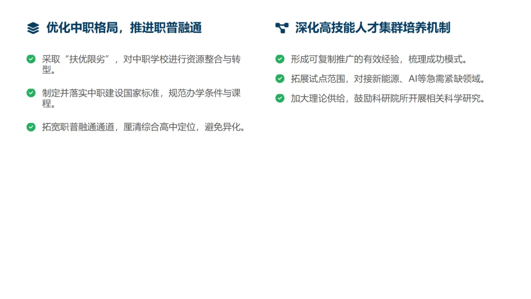 夯实基础:优化中职教育发展格局,制定并落实国家标准,同时审慎推进高中阶段职普融通发展。