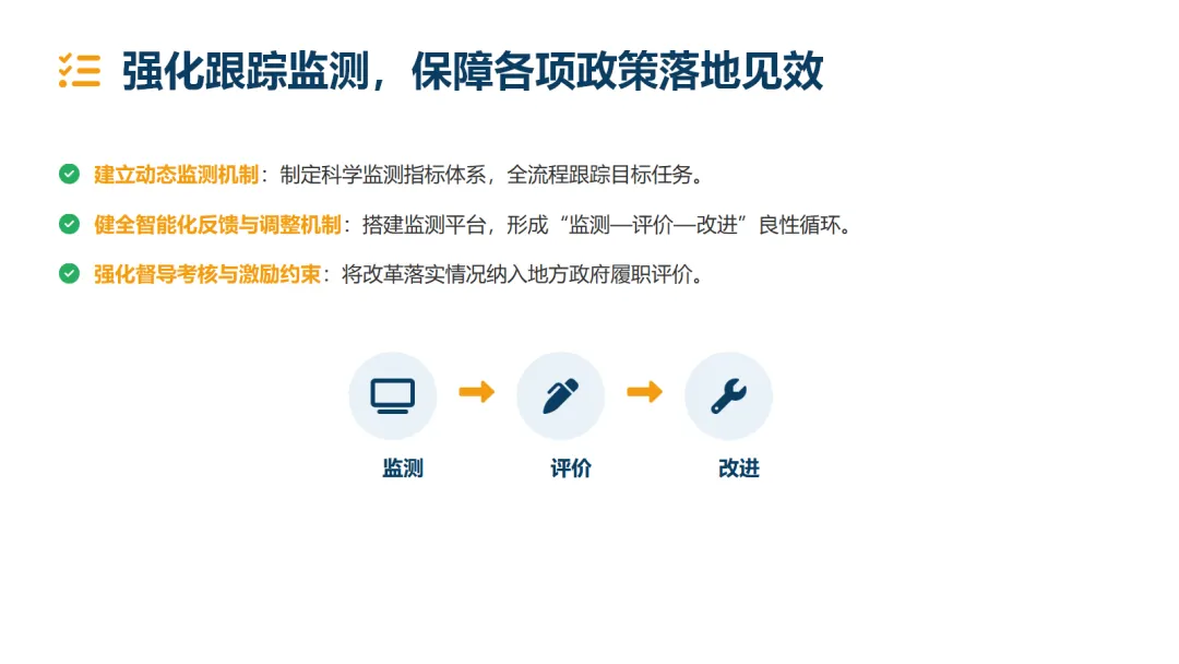 政策保障:建立动态监测与智能化反馈机制,将改革成效纳入政府履职评价,确保各项政策落地见效。