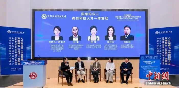 12月28日,《人才蓝皮书:中国创新人才发展报告(2025)》在首都经济贸易大学发布。图为与会嘉宾围绕“教育科技人才一体发展”展开讨论。首都经济贸易大学供图。