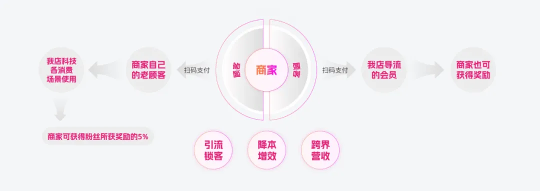 商家可免费入驻平台,无需交押金。商家向平台支付一定比例的费用作为运营推广成本,就能获得相应积分奖励。此外,商家通过支付码绑定,可从消费者积分中获得一定比例回报。商家获得的积分和抵用券,能在平台用于消费或推广。