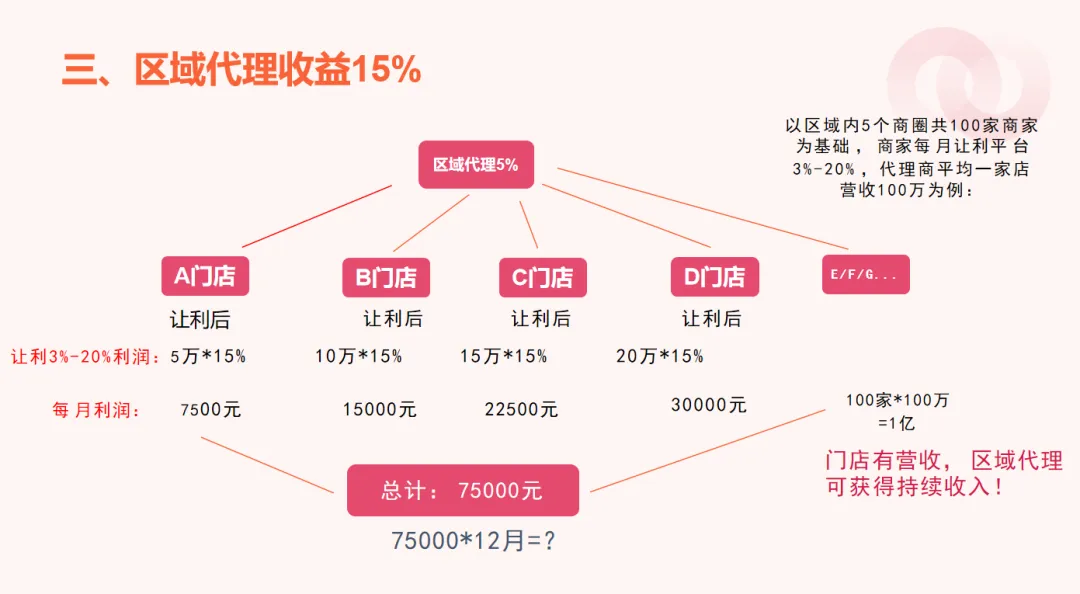 核心负责指定区域内商家管理,获取商家让利分成。此模式可助力平台拓展区域覆盖,同时为代理提供稳定收益。