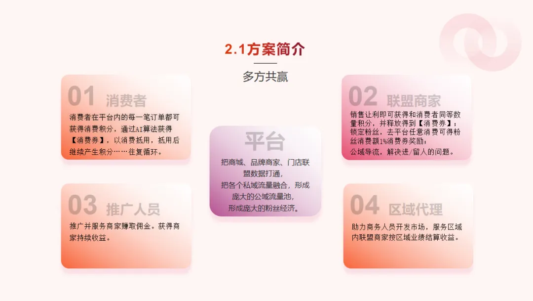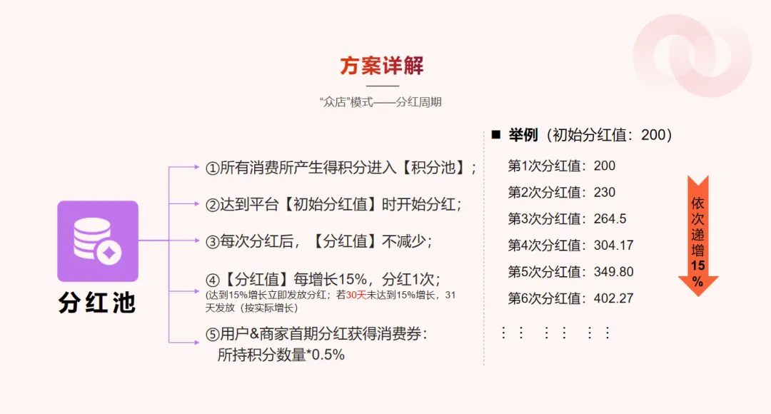 消费者在平台每消费一次,就能得到金币和积分。积分可通过平台算法,在一定周期内实现增值,能转化为积分抵用券。同时,积分会进入平台积分池,当积分池达到特定数值时,平台会向消费者和商家发放积分抵用券,还会依据积分池增长情况,定期额外发放金币和抵用券。