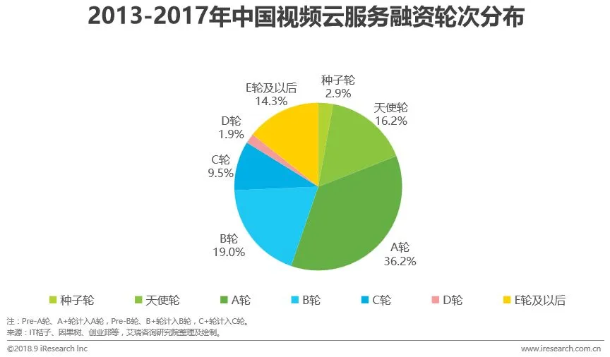 与云服务领域的投融资趋势大致吻合,视频云服务的投资热度在2015年达到高潮后逐渐有所回落。考虑到视频云服务行业的技术门槛较高,新进入的创业公司团队通常在音视频领域有一定的技术背景。从融资轮次的角度看,近五年的融资项目中超过50%集中在A轮和B轮,同时有14.3%的融资事件为E轮及以后。对于视频云服务而言,PaaS层服务涉及大量的基础资源成本,在市场扩张的过程中需要持续不断的资金投入;SaaS服务回款速度慢,创业公司现金流压力大,行业规模效应明显。随着主流的公有云厂商相继进入市场,IaaS和PaaS层面的竞争空间已经逐步收窄,未来创业公司的机会将更多体现在垂直领域和SaaS应用上。