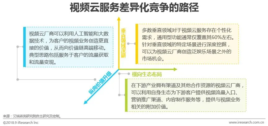 从当前视频云厂商的实践来看,主要有三种应对同质化竞争的思路。其一,横向生态布局,在视频产业中布局广泛的厂商,可利用自身的生态优势为客户创造云服务之外的附加价值。其二,纵向价值升级,厂商可围绕视频云做延伸,通过服务于客户业务发展的核心环节,实现价值链条升级。其三,垂直领域深耕,考虑到泛娱乐场景竞争愈发激烈,进一步拓展的空间有限,尤其中小厂商和创业者可深耕垂直领域,率先发力以取得有别于主流公有云厂商的差异化竞争优势。