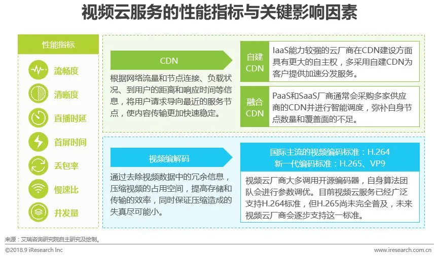 视频编解码和内容分发网络是视频云服务中的两项关键技术。当前视频编码已经进入到后1080P时代,由H.264主导的视频编码标准正在被撼动。早在2013年,新一代的视频编码标准H.265就完成了标准的制定工作,但受限于当时的应用环境而没有得到广泛的普及。相比H.264,H.265的最大优势是可以在维持画质基本不变的前提下,将视频传输的带宽减少到H.264的一半。目前主流的视频云厂商部分或已经支持H.265标准,或正在计划支持H.265标准,随着未来软件和硬件环境的支持,H.265标准将成为视频云服务的标配。